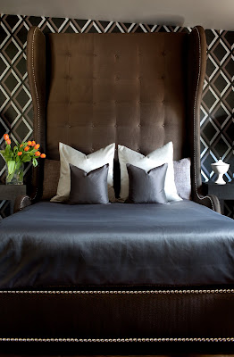 When it comes to bedrooms, Brian likes to make sure the bed itself is the breakout star. He designed this super tall bed to resemble the look of a traditional wingback chair. To take focus off the sloping ceiling, he papered the walls in a geometric wallpaper [Lee Jofa's "Pompeian"] which ties in perfectly with the color scheme of grey, dark brown and silver.