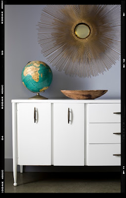 Vintage is king in almost all of Brian's spaces. This dining room was done on a teeny budget but you can't tell due to clever pairings. A Decatur antique store had the farmhouse chic pendants on sale for less than $40 apiece. Brian spray painted them red and added longer conduit to conceal the old wires. He found the mid-century Danish chairs at a flea market for $80 and had them sprayed with charcoal lacquer then added new red vinyl cushions to complement the lighting above. Walls painted in a muted blue-grey [Billowing Clouds from Porter] made the original millwork standout in high gloss white. Photography plays a part here as well with equestrian art by Sarah Dorio mounted behind Plexiglas. A modern IKEA table and a FLOR area rug [in Rawhide] are the only brand new design elements in the space.
