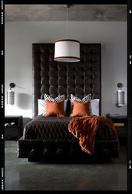 Brian's client, a news anchor, wanted his master bedroom to feel chic and modern with color but not too much color. He painted the walls in a light grey tone to keep it light and play up the dark grey tone of the concrete floors. The client was okay with spending more on a custom bed [designed by Brian] but wanted to keep costs low on tables, lighting and bedding. Target's Thomas O'Brien coverlet was less than $100 thus allowing Brian to splurge on David Hicks La Fiorentina fabric on the throw pillows.