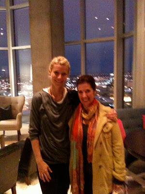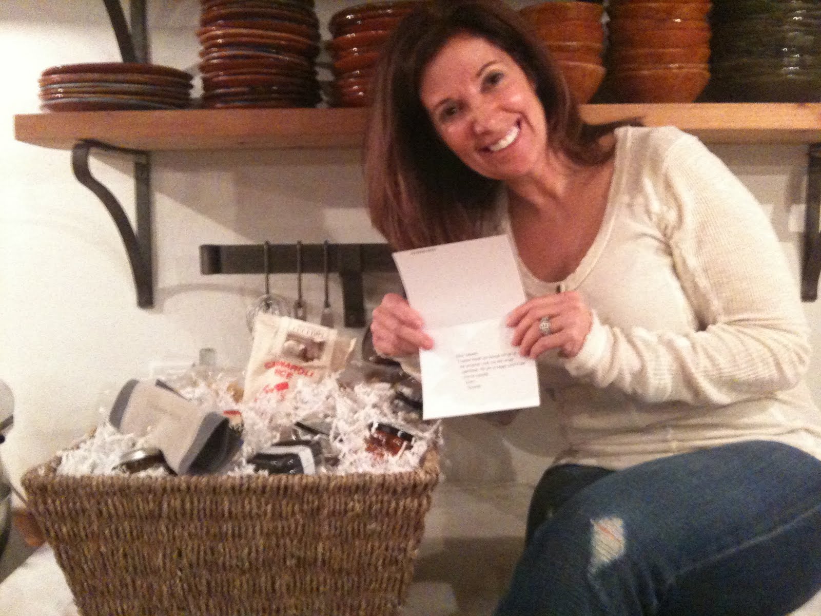This is me in my kitchen with the gift basket Gwyneth sent after the completion of the apartment. We really enjoyed all the goodies, my kids loved it. The card could not have been more kind, but I know now that's how she rolls. :)